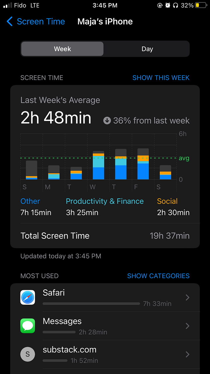 I gained a whopping 12.5 hours back in my week. Is it where I want to be? No. I still spent over two full working days on my phone in one week. I still picked up my phone 85 times today. But I am moving in the right direction, and it feels good.