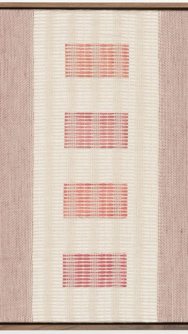 Rachel Duvall’s total mastery of colour, geometric form, texture, and layering. Her woven pieces are beautifully balanced and I particularly admire her use of floater frames.
